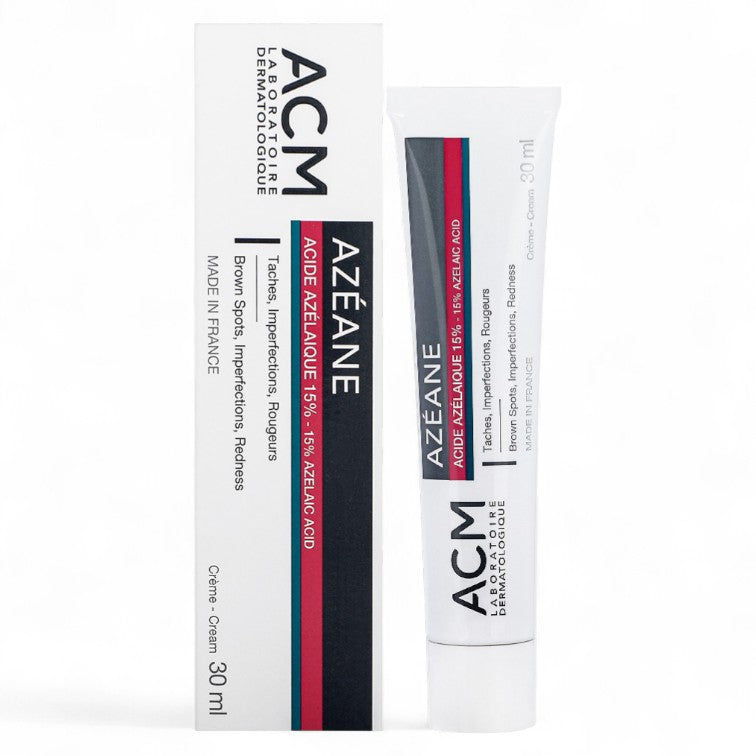 Transform your skin with ACM Azéane Acid 15% Cream 30ML, a multi-action treatment designed to address various skin concerns. Formulated with a potent 15% concentration of azelaic acid, this cream effectively reduces dark spots, imperfections, and redness, while regulating sebum production and refining skin texture. It promotes natural radiance and helps fade post-acne marks, leading to a more even and luminous complexion. Suitable for all skin types, especially those with blemishes, hyperpigmentation, and redness, this cream moisturizes and improves the overall appearance of your skin. Achieve clearer, smoother, and more radiant skin with ACM Azéane Acid 15% Cream.