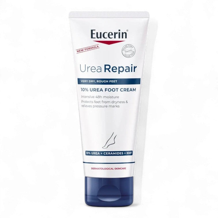 Provide intensive hydration and soothing relief for very dry and rough feet with Eucerin UreaRepair Plus Intensive Hydrating Foot Cream 100ml. This clinically proven formula, enriched with 5% Urea, Ceramide, and other Natural Moisturizing Factors (NMF), delivers immediate relief and 48-hour hydration. It effectively reduces engrosada skin and calluses, softening the skin on heels and rough patches. Its fast-absorbing, non-greasy texture makes it ideal for daily use, leaving feet smooth, supple, and comfortable. Suitable for very dry skin and conditions like diabetic foot.
